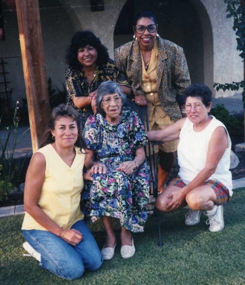 Photo taken in September 1994 with Sylvia and Sandra Mendez. Aunt Sally Vidaurri, Alice Vidaurri and Oliva Vidaurri |